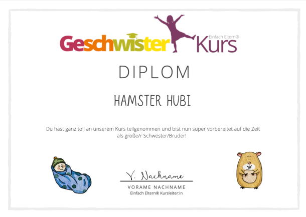 Mit Puppen in der Größe eines Neugeborenen werden die teilnehmenden Kinder lernen, eine kleine Stoffwindel anzulegen und erfahren, warum sie später gerne helfen aber nicht selbst wickeln können. Anhand von Bildkarten visualisiert die Kursleiter:in, was das Baby bereits im Bauch und später nach der Geburt kann und was noch nicht. Am Ende erhalten die großen Brüder und Schwestern ihr erworbenes Geschwisterdiplom mit dem eigenen Namen.